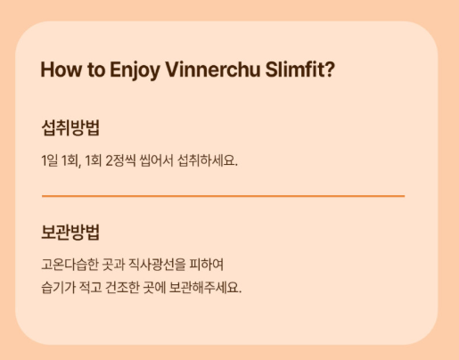 비너츄는 가르시니아 캄보지아 성분을 주성분으로 하여 설계된 제품으로 체지방에 중점을 둔 제품입니다. 이와 더불어 단호박 추출물, 파인애플 추출물, 히비스커스, 흰 강낭콩 등 여러 다이어트 제품에서 사용하는 원료들을 배합하여 체중 감량뿐만 아니라. 식이섬유로 인한 포만감까지 줄 수 있는 제품입니다.